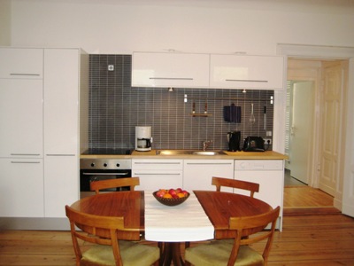 - eine voll ausgestattete Küchenzeile mit Kühlschrank, Kühlfach, Backofen, Cerankochfeld, Mikrowelle, Toaster, Wasserkocher, Kaffeemaschine