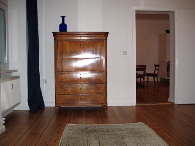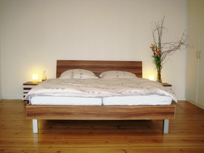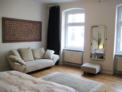 Das geräumige Schlafzimmer verfügt über ein großes Doppelbett mit Nachttischen und Nachttischlampen, ein gemütliches Sofa, einen Sekretär und einen großen Schrank.