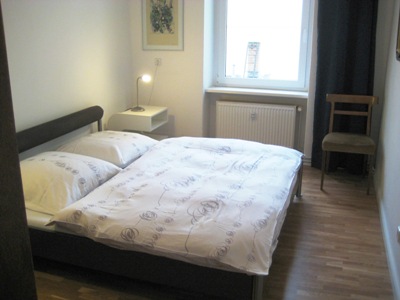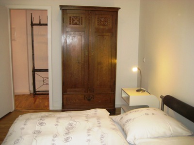 Das Schlafzimmer ist mit einem großen Doppelbett mit Nachttischen, Nachttischlampen und einem schönen Schrank eingerichtet.