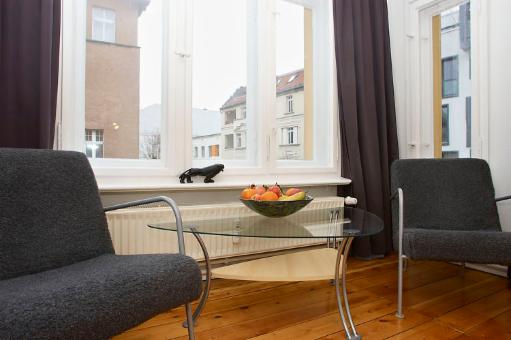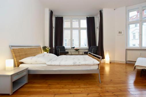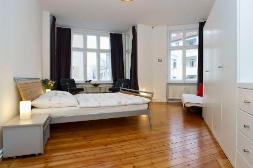 Das geräumige Schlafzimmer verfügt über ein großes Doppelbett mit Nachttischen und Nachttischlampen, ein Schlafsofa (1,20 m x 2,00 m), einen großen Schrank und eine kleine Sitzecke im Erker mit tollem Blick in die Schröderstraße. |