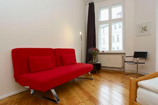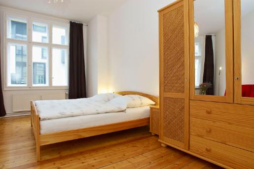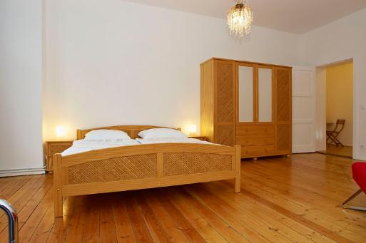 Das geräumige Schlafzimmer verfügt über ein großes Doppelbett mit Nachttischen und Nachttischlampen, ein Schlafsofa (1,20 m x 2,00 m) und einen großen Schrank.